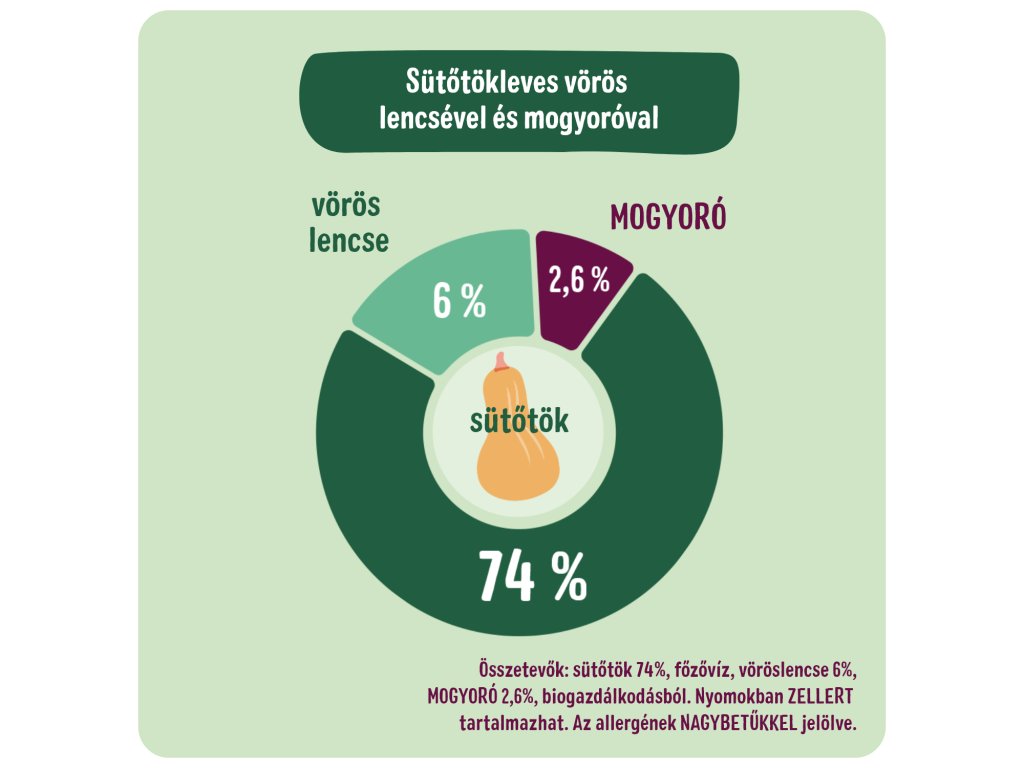 Összetevők: *sütőtök 74%, főzővíz, *vöröslencse 6%, *MOGYORÓ 2,6%. *a biogazdálkodásból. Nyomokban zellert tartalmazhat. Az allergének NAGY betűkkel jelölve.