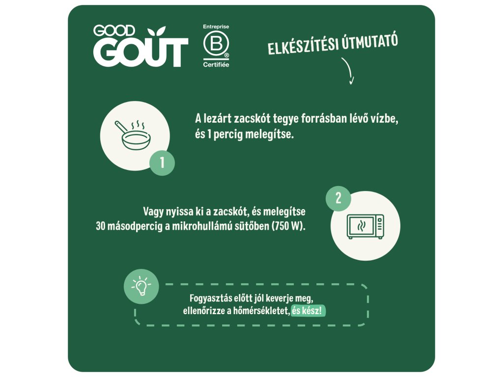 Tegye a zárt zacskót forrásban lévő vízbe, és melegítse 1 percig, vagy nyissa ki a zacskót, és melegítse 30 másodpercig mikrohullámú sütőben (750 W). Fogyasztás előtt jól keverje meg, ellenőrizze a hőmérsékletet és kész!